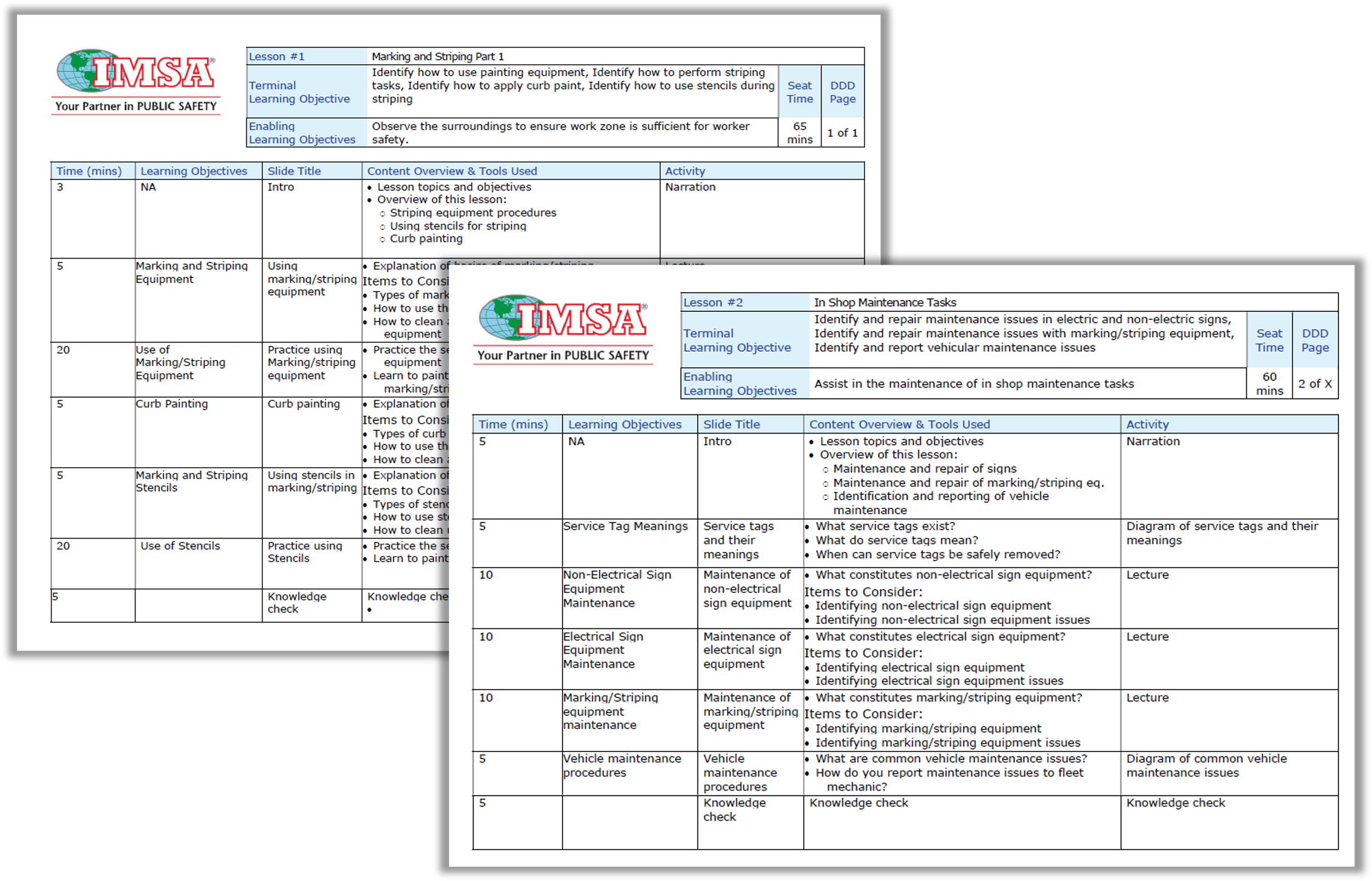 The International Municipal Signal Association (IMSA) is building a training course for new Technicians to become IMSA certified. I worked with IMSA to develop a lesson plan for both the Signs and Markings, and Roadway Lighting courses. Below are a few selected examples from the Signs and Markings development process.